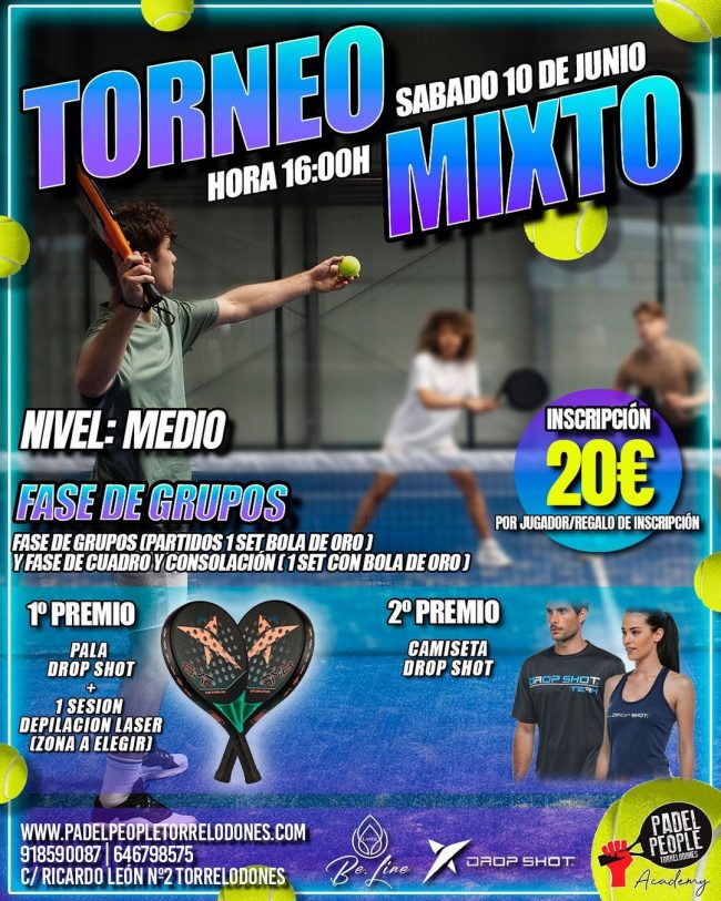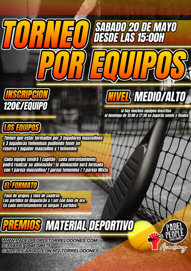 INSCRIPCIÓN CERRADA 👱♂👱♀Torneo por equipos mixto / 23-24 de mayo 📍Club Padelpeople TORRELODONES 🗓 Sabado 23 de mayo , en caso de la participación excesiva de equipos se podrían ampliar los torneos al domingo . ⏱ 16:30h a 22:00h (23:00 en caso de retraso ) 🎚 Medio-Alto 💳 20€ por jugador@ / 120€ el equipo…